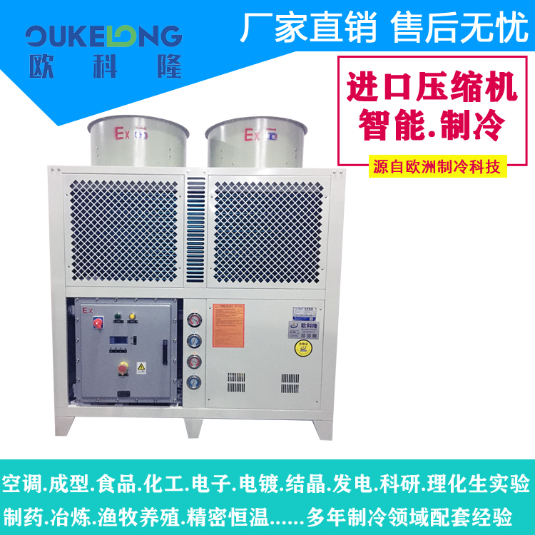 歐科隆15匹防爆冷水機專為化工、制藥、鋰電池等易燃易爆環(huán)境研發(fā),通過國家Ex dⅡBT4防爆認證,整機采用防爆壓縮機、防爆電控系統(tǒng)及無火花元件,確保危險場所安全運行,為關(guān)鍵生產(chǎn)流程提供可靠制冷保障。